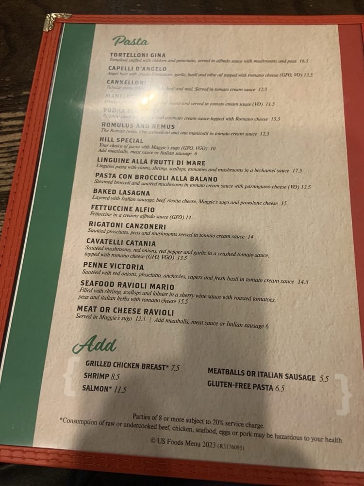 Your choice of pasta with Maggie’s sugo. Add meatballs, meat sauce or Italian sausage.